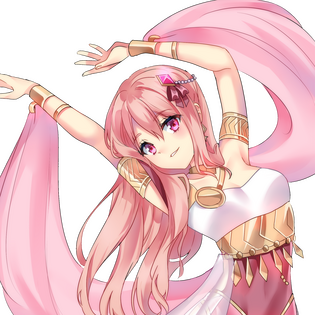 In the 5 year time-skip, Lippe grows up to be a renowned dancer like her mother, she wears pink eyeshadow along with red lipstick as her peach pink hair is lightly tinged blue, due to her mother's hair color fading in to her own hair. She managed to grow to the height of 4'10, and parts of her hair are braided and tied back with a long, red ribbon that accompanies a diamond shaped hair clip, and a golden circlet would be worn around her head.She dons a thick white shirt that is worn underneath a pink and short overdress. She also has a skirt underneath the overdress that has a fur petticoat underneath it. Underneath her clothing, she wears high waist leggings that cover her stomach and long gloves, both being the same color. A cropped jacket with fur inside is worn outside of her outfit and she wears long, high heeled boots that make her stand at 5'2 with them on. Lippe also wears earrings that hang from her ears and one bangle on each of her wrists and a pair on each of her ankles.